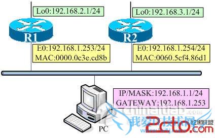 如图所示,主机PC要ping路由器R2的loopback 0地址:192.168.3.1,主机将判断出目标属于不同的网段,因此它要将ICMP请求包发往自己的默认网关192.168.1.253(路由器R1的E0接口)?但是,这之前主机PC首先必须发送ARP请求,请求路由器R1的E0(192.168.1.253)的MAC地址。