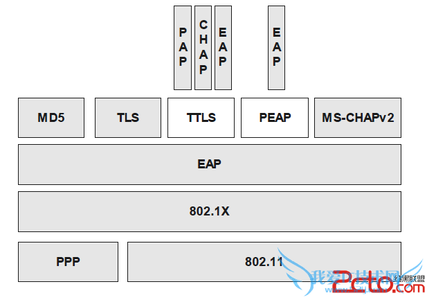 EAP 本身不是一个认证机制,而是一个通用架构。用来传输实际的认证协议。EAP 的好处就是当一个新的认证协议发展出来的时候,基础的EAP 机制不需要随着改变。目前有超过20 种不同的EAP 协议。