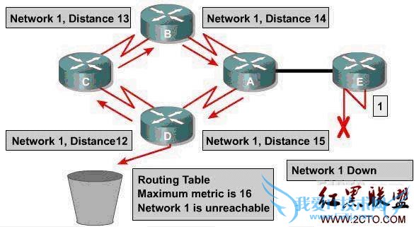 路由毒化(route poisoning):路由表明一个网络或子网不可达(最大跳数+1),而不是在更新中不包括该网络信息,暗示不可达。