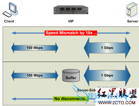 负载均衡设备采用full-proxy的工作模式,当客户端数据传输速度与服务器端传输速度存在差异(如上图),通过tcp buffering的技术可弥补这样的差异,保证数据传输的通畅。