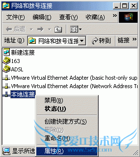 第二步,在“本地连接”上按鼠标右键,选择“属性”: