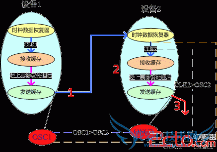 1) 设备1以其自身的工作时钟(OSC1) 向设备2发送到待发数据;