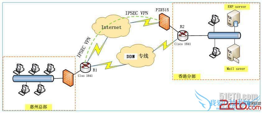 最近接到的一个项目,客户总部在惠州,分部在香港,在香港分部设有ERP服务器与邮件服务器,总部出口为铁通10M光纤与网通1M DDN 专线(新增),原总部是用netscreen 防火墙与香港的pix 515作IPsec VPN对接,现客户要求是新增一条网通DDN专线用来专跑ERP数据业务,就是要求平时总部去分部访问ERP服务器的数据走DDN专线,访问邮件服务器的数据走ipsecVPN,但当这两条链路其中有出现故障中断时,能做到链路自动切换,例DDN专线出现故障,原走这条线路的ERP数据能自动切换到ipsec VPN线路去,如果线路恢复线路又自动切换。