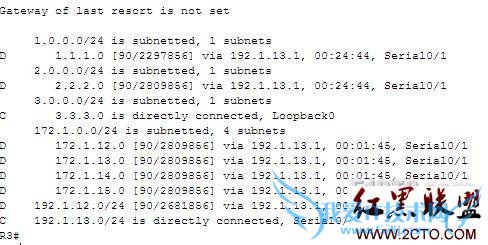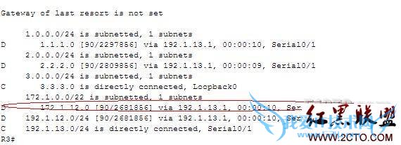 5、在R1上使用命令ip summary-address eigrp 将会自动汇总更详细的网络地址通告给路由R3,在R1上
