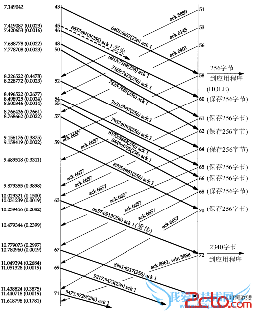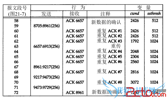 在快速重传和快速恢复阶段,我们收到报文段66、68和70中的重复的ACK后才发送新的数据,而不是在接收到报文段64和65中重复的ACK之后就发送。这是cwnd的取值与未被确认的数据大小比较的结果。当报文段65到达时,cwnd为2048,但未被确认的数据有2304字节(9个报文段:46, 48, 50, 52, 54, 55, 57, 59和63),因此不能发送任何数据。当报文段65到达后,cwnd被置为2304,此时我们仍不能进行发送。但是当报文段66到达时,cwnd为2560,所以我们可以发送1个新的数据报文段。类似地,当报文段68到达时,cwnd等于2816,该数值大于未被确认的2560字节的数据大小,因此我们可以发送另1个新的数据报文段。报文段70到达时也进行了类似的处理。