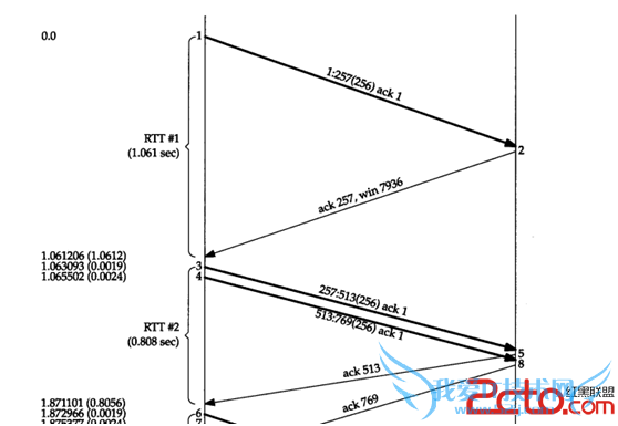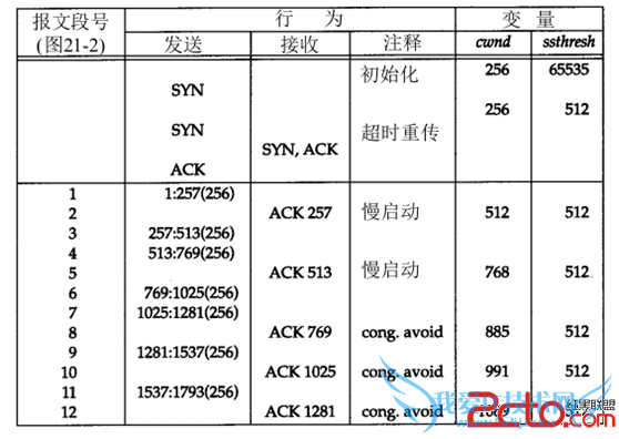当ACK 257到达时,因为cwnd小于等于ssthresh,因此仍然处于慢启动阶段,于是将cwnd增加256字节。当收到ACK 513时,进行同样的处理。