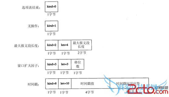 每个选项的开始是1字节kind字段,说明选项的类型。kind字段为0和1的选项仅占1个字节。其他的选项在kind字节后还有len字节。它说明的长度是指总长度,包括kind字节和len字节。