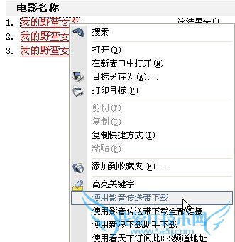点击“搜索电影”,很快就能显示出搜索结果,在显示搜索到的列表中选择一个电影名链接点击鼠标右键,就会出现“使用影音传送带下载”的选项(图7),