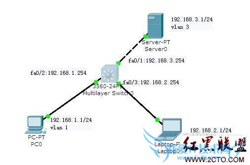 在一个局域网里,禁止财务部(vlan1)和销售部(vlan2)互相通信,不过它们都可以访问sever服务器(vlan3),使它们在服务器上实现共享文件。