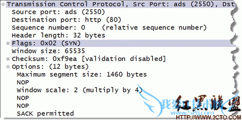 图2:这个主机在它的TCP握手数据包中宣告了Window Scale的因数为2。这个尺寸因数将实际接收窗口大小增大到262,140字节