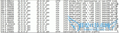 如果一个主机在文件传输时缓存空间耗尽,它必须回送一个包含Window=0字段值的数据包。TCP节点必须停止发送数据,直至一个窗口更新(Window Update)数据包发送过来。一个窗口更新数据包是一个简单的ACK数据包,它带有非0窗口大小值。当窗口更新过程发生后,数据流可能将重新继续。图1显示了数据流已经停止,因为一个主机宣告了窗口0(Window Zero)的状况。
