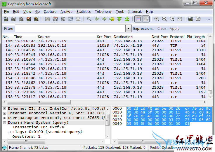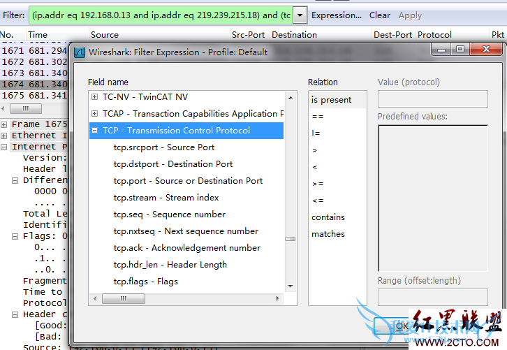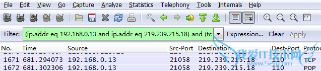 实际上,上面的追踪数据流的的菜单,只是Wireshark众多已经定制好的过滤条件中的一个。当你执行这个会话过滤后,你会在菜单栏下方的“Filter”中,看到你的过滤条件。