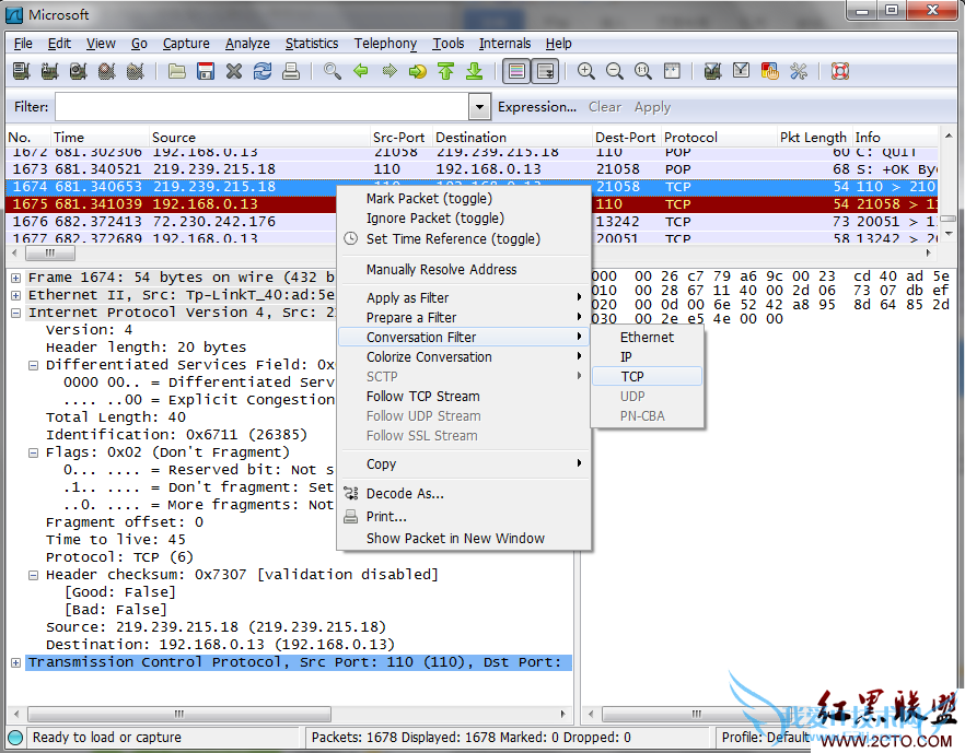 在使用Wireshark进行排错的过程中,我们捕获的数据包可能包含众多的会话或协议类型,但实际上我们只是针对其中某些数据流感兴趣。因此,我们需要将这些会话单独过滤出来,以便于我们进行进一步的分析。这时候,我们只需要在我们感兴趣的数据流中的某一个包上点击鼠标右键,然后在弹出菜单中选择“Conversation Filter –> TCP”,我们就完成了对这个TCP会话的过滤。这个会话有固定的源地址、源端口、目的地址和目的端口。