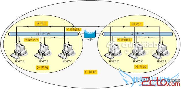 但是,如果主机C发送了一个目标是所有主机的广播类型数据包时,网桥要转发这样的数据包。网桥两侧的两个网段总线上的所有主机都要接收该广播数据包。因此,网段1和网段2仍属于同一个广播域。