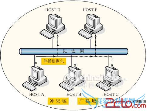 在图1中,主机A只是想要发送一个单播数据包给主机B。但由于传统共享式以太网的广播性质,接入到总线上的所有主机都将收到此单播数据包。同时,此时如果任何第二方,包括主机B也要发送数据到总线上都将冲突,导致双方数据发送失败。我们称连接在总线上的所有主机共同构成了一个冲突域。