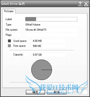 接下来,我们可以向Gmail Drive上传文件,为管理方面起见,建议首先选择右键菜单中的“New→Folder”命令创建相应的文件夹(直接拖曳也行),注意请使用英文字符作为文件名,而且字符长度不能超过40个,上传文件的操作非常简单,进入相应的文件夹选择“Paste”命令或者直接从资源管理器中拖曳过来即可。注意只有创建了文件夹或上传文件后,“Gmail Drive属性”对话框中才会完整显示相应的磁盘属性信息(见图2)。