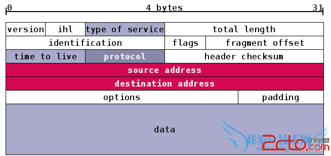 IP协议可以分为IPv4和IPv6两种。IPv6是改进版本,用于在未来取代IPv4协议。出于本文的目的,我们可以暂时忽略两者的区别,只以IPv4为例。下面是IPv4的格式