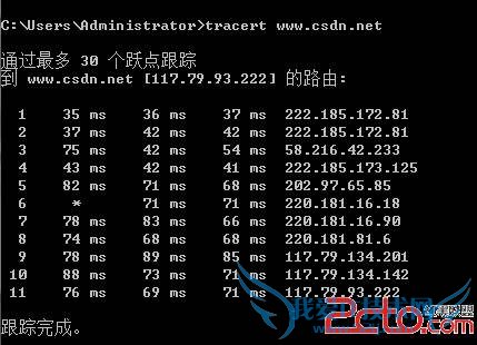 tracert工具用于观察两台主机之间的路径。例如测试一下,我主机到www.csdn.net的路径。