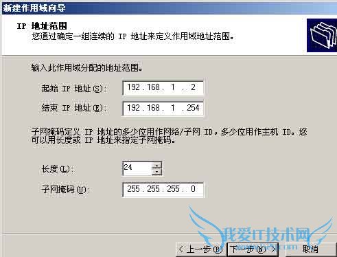 在随后弹出的图3所示界面中,我们可以把局域网中需要进行动态配置网关地址和DNS服务器地址的所有客户端IP地址范围输入其中,比方说要是我们希望把作用的范围限制在“192.168.1.2”~“192.168.1.254”地址段,那就应该在图3界面中的起始IP地址处输入“192.168.1.2”,在结束IP地址处输入“192.168.1.254”,然后在长度处输入“24”,在子网掩码处输入“255.255.255.0”,接着再单击“下一步”按钮;