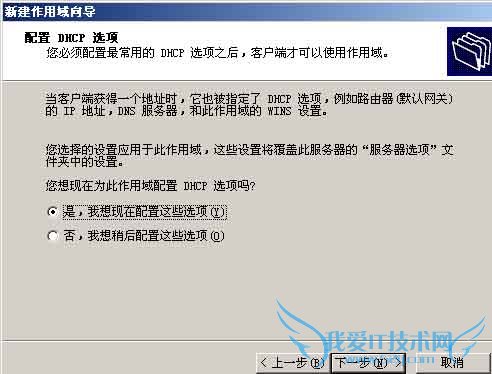 如果局域网中有某些客户机不需要进行动态配置的话,就可以在其后弹出的“添加排除”框中输入需要排除在外的客户端IP地址;接下来向导窗口提示我们要设置租约期限,系统默认的租约期限为“8”天,如果我们需要修改的话,可以直接输入合适的数值;设置好租约期限后,系统将打开如图4所示的向导窗口,选中该窗口中的“是,我想现在配置这些选项”,再单击“下一步”按钮,随后我们就能为局域网中所有客户端分配网络参数了。