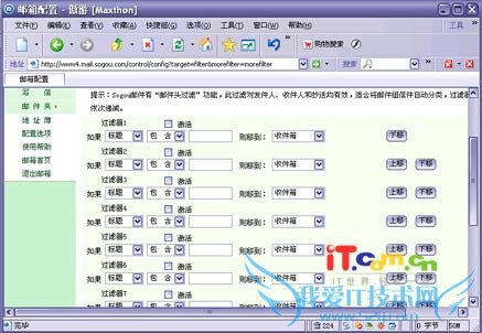 下面重点说一下邮箱的多重垃圾邮件过滤功能。现在垃圾邮件可以是说邮箱最大的天敌,所以大有对垃圾邮件是深恶痛绝,过滤垃圾邮件能力的强弱成了衡量邮箱功能的一个重要标准。Sogou推出的这款免费邮箱具有多重过滤垃圾邮件功能,点击“配置选项—超级过滤设置”,在这里我们可以根据“邮件头过滤”功能,来对邮件进行多重过滤,过滤器可以设为十个等级,且从一到十依次递减,相信通过这十个等级的设置,垃圾邮件将无处藏身了,同时还可以根据过滤设置功能,来对收到的邮件进行自动分类管理,邮件会根据设置自动的归到其相应的邮件组中。