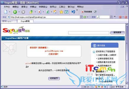 首先我们看一下sogou 2G邮箱的注册,在地址栏输入其网址:http://www.sogou.com/,点击其页面上的“搜狗Gmail邮箱”(如图1所示),在弹出的注册窗口中输入你要注册的ID号(因刚刚推出,所以大家快来抢注自己喜欢的ID吧),然后点击注册,接着在下面的窗口中输入密码等必要信息,点击确定后就弹出注册成功窗口了(如图2所示),这样一分钟后就可以进入邮箱了。