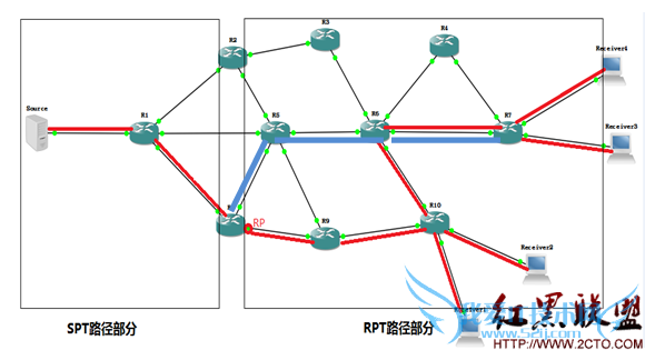 (注:图2 还配置了组播协议,大家可以忽略前面SPT路径部分,只看RPT部分即可)