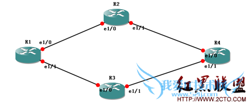 计算R1到R4最短路径,两条路径上cost和一样,那么我通过实验得出的结论是R1会选择IP地址较大的e1/0口发包,即选R1——R2——R4这条路。