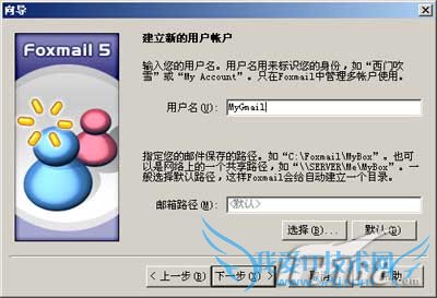 首先在Foxmail中选择“账户→新建”进行账户添加向导,首先设置“用户名”和“邮箱路径”,这个设置随意。