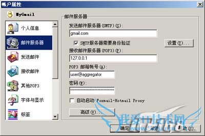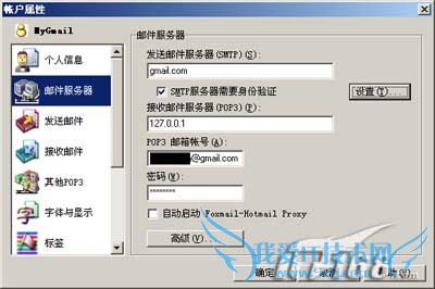 接下来右键点击刚刚添加的账户,选择“属性”菜单,切换到“邮件服务器”标签,将“接收邮件服务器(POP3)”设置为“127.0.0.1”,“POP3邮箱账号”设置为Gmail账号,注意要带上“@gmail.com”。