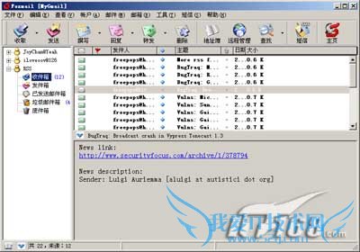 玩Blog的人大都用FeeDdemon来阅读RSS链接,不过不用再装额外的软件,只要你有FreePOPs就可以用邮件客户端来接受RSS!使用的其它设置方法请按照前面的介绍来进行,所不同的是,在账户属性设置的“邮件服务器”标签中需要做如下设置:“POP3邮箱账号”设置为“xxx@aggregator”,其中xxx随便你输入什么单词,比如user;“密码”一项设置为RSS链接的地址,比如:http://www.donews.net/rss.xml。