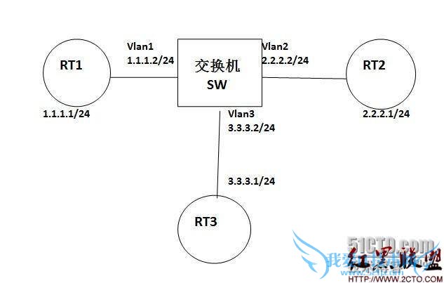 1、第一个图是你的拓扑,这个是我自己画的,交换机分别和3个路由器相连,地址规划我在图上注明了;