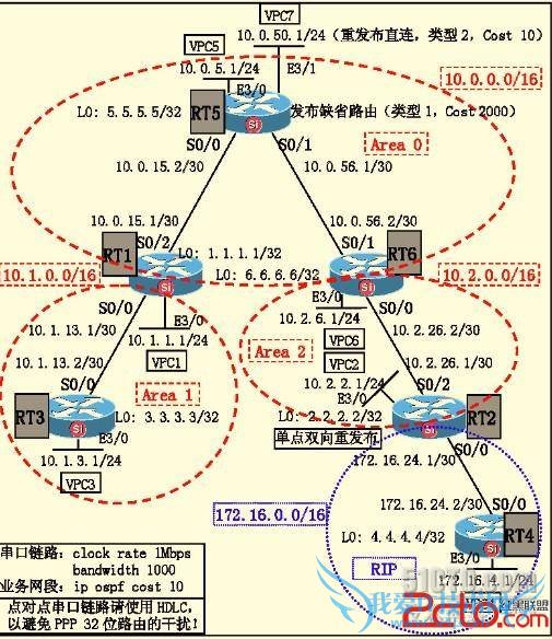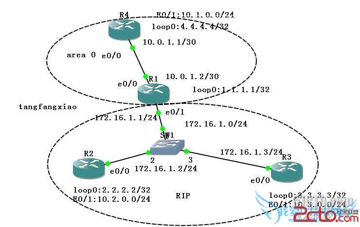 此图中R4和R1在区域0,R1通过RIP重分布学习到外部路由,R2和R3都运行RIP。中间的交换机主要用来模拟出一个总线型网络,R1 E0/1 , R2 R3 E0/0都在同一网段。