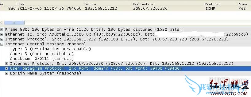 这里是我的宿主机给open DNS发送的端口不可达。type=3,code=3的icmp差错报文。原因就是我主机并没有59400这个端口处于listening状态。另外端口不可达包含的东西很多,上面的报文居然把dns的请求都包含进来了。。。