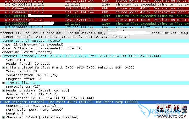 router发出udp报文,这里我修改目的的端口从10000开始。一般TTL小于5的packet,抓包软件都会警告的。(ttl过小啊)