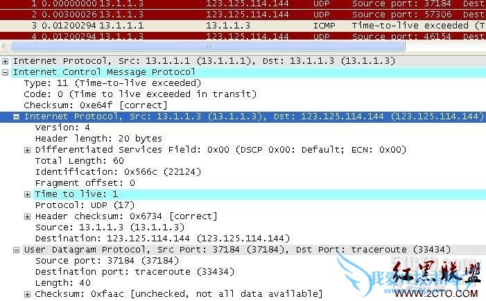 Traceroute是通过发送UDP的报文,通过访问目的的一个高端口(这个端口如果处于监听状态就玩玩了),将ttl设置递增(起始为1),以接受ttl超时获得每一跳入口地址,到达目的后回复一个端口不可达的报文得知到达目的地。