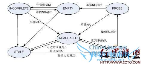 图中实线箭头表示由NS/NA报文交互导致的状态变化,各状态间的相互转换如下: