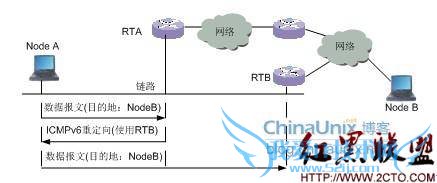 如图2-12所示,NodeA的默认路由器为RTA,现在NodeA想发送数据报文到NodeB,路由器重定向机制需要经过以下过程:
