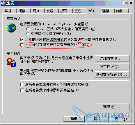 另外:有些朋友反映OE收信时打不开附件。可以按以下步骤来解决。在OE菜单里点击“工具--选项”。然后转到安全选项,在病毒防护下面的“不允许保存或打开可能有病毒的附件”(如图3)前的对勾去掉就可以把附件打开了。