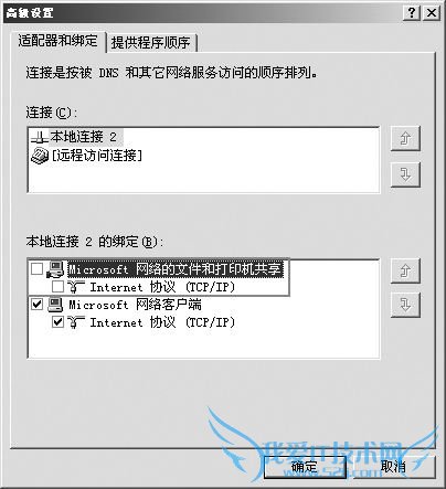 小提示: ★当然,对于文件和打印共享服务的137、138、139和445端口,还可以采用以下的方法来关闭。右击“网络邻居→属性”命令,选择“网络和拨号连接”对话框的“高级”菜单,选择“高级设置”命令,进入高级设置对话框(如图4),在出现的画面中的上部选择所需的连接,然后将下部的“Microsoft网络的文件和打印机共享”取消,即可禁止这几个端口。