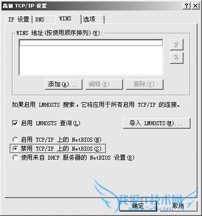 ★NETBIOS是很多安全缺陷的源泉,对于不需要提供文件和打印共享的主机,还可以将绑定在TCP/IP协议的NETBIOS给关闭,避免针对NETBIOS的攻击。双击“本地连接 属性”中的“TCP/IP协议→属性→高级”,进入“高级TCP/IP设置”对话框,选择“WINS”标签,勾选“禁用TCP/IP上的NETBIOS”单选按钮(如图5),这样就可以避免来自NETBIOS的攻击了。