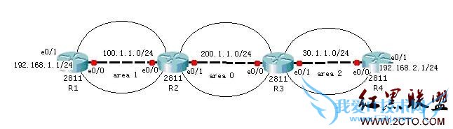 由4台路由组成,R1和R4的e0/1口分别模拟两端局域网的pc1和pc2