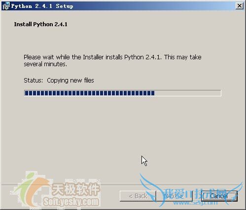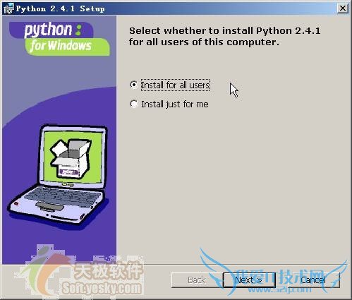Windows用户可以访问http://www.python.org/download/ 获取最新的Python安装包,当前最新版本为2.4.1,一般选择Windows binary不包含源文件的安装版本即可。下载到本地之后,直接双击程序进行安装,出现图1所示对话框,选择Install for all users,点击Next。