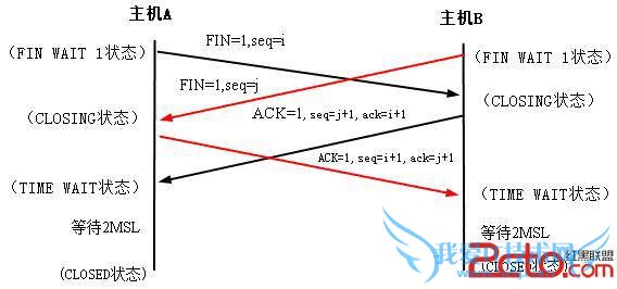 当两端对应的网络应用层进程同时调用CLOSE原语,发送FIN数据段执行关闭命令时,两端均从ESTABLISHED状态转变为FIN WAIT 1状态。任意一方收到对端发来的FIN数据段后,其状态均由FIN WAIT 1转变到CLOSING状态,并发送最后的ACK数据段。当收到最后的ACK数据段后,状态转变化TIME_WAIT,在等待2MSL后进入到CLOSED状态,最终释放整个TCP传输连接。