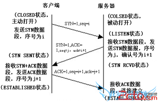 (3)服务器在收到来自客户端的SYN数据段后,发回一个SYN字段置1(表示此为同步数据段),ACK字段置1(表示此为确认数据段),ack(确认号)=i+1的应答数据段(假设初始序号为j),被动打开端口,进入到SYN RCVD(已收到一个连接请求,但未进行确认)状态。这里要注意的是确认号是i+1,而不是i,表示服务器希望接收的下一下数据段序号为i+1。