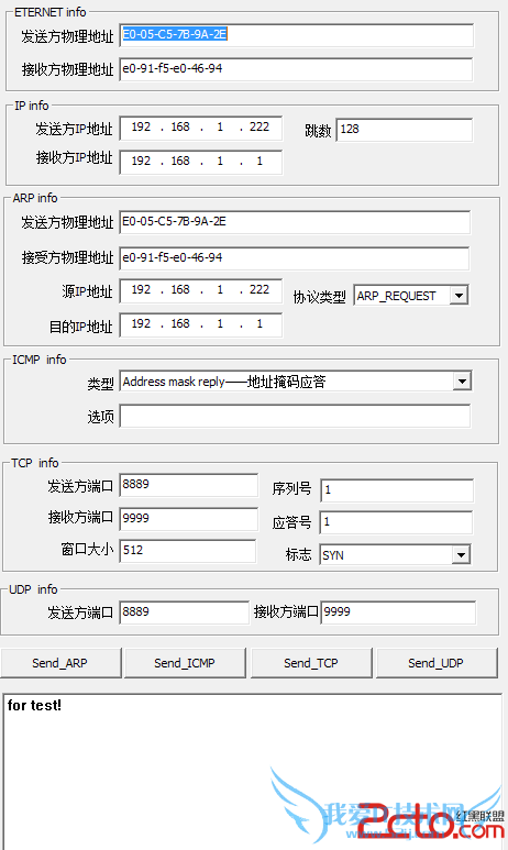 下面介绍一下基本操作,程序就一个exe文件,win界面,三个区域,分别是发送区,监视区和设置要捕获的包的过滤条件,当然都比较简单的过滤条件。这个小程序的功能就是可以自定义发送apr包,tcp包,udp包,icmp包,可以定义包中的各个字段。并且可以开启监视功能,发送的包会被记录,返回的包也会被记录并被显示(适用于winxp以上操作系统)