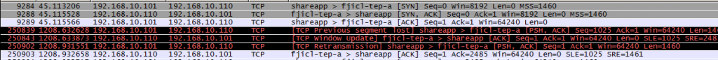 如上图,由于某种原因,发送端发给接收端的数据包序号1025,丢失了序号为1的包(250839)