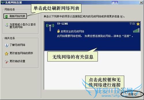 如何才能知道本区域内无线网络的有关情况呢?如何断开或连接某个无线网络呢?无线网卡可不会告诉我们,不过我们可以点击“查看无线网络”按钮,在弹出的“无线网络连接”窗口中,右侧便是无线网卡在本区域内探测到的可用无线的网络,从中我们可以获得网络是否加密、无线网络的名称、连接情况以及信号强度等信息(图2)。