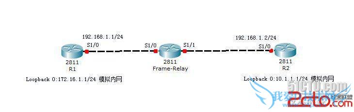 首先说明一下DLCI号的分配,R1为102;R2为201;中间路由器模拟帧中继交换机,其它接口信息与IP信息如拓扑所示.