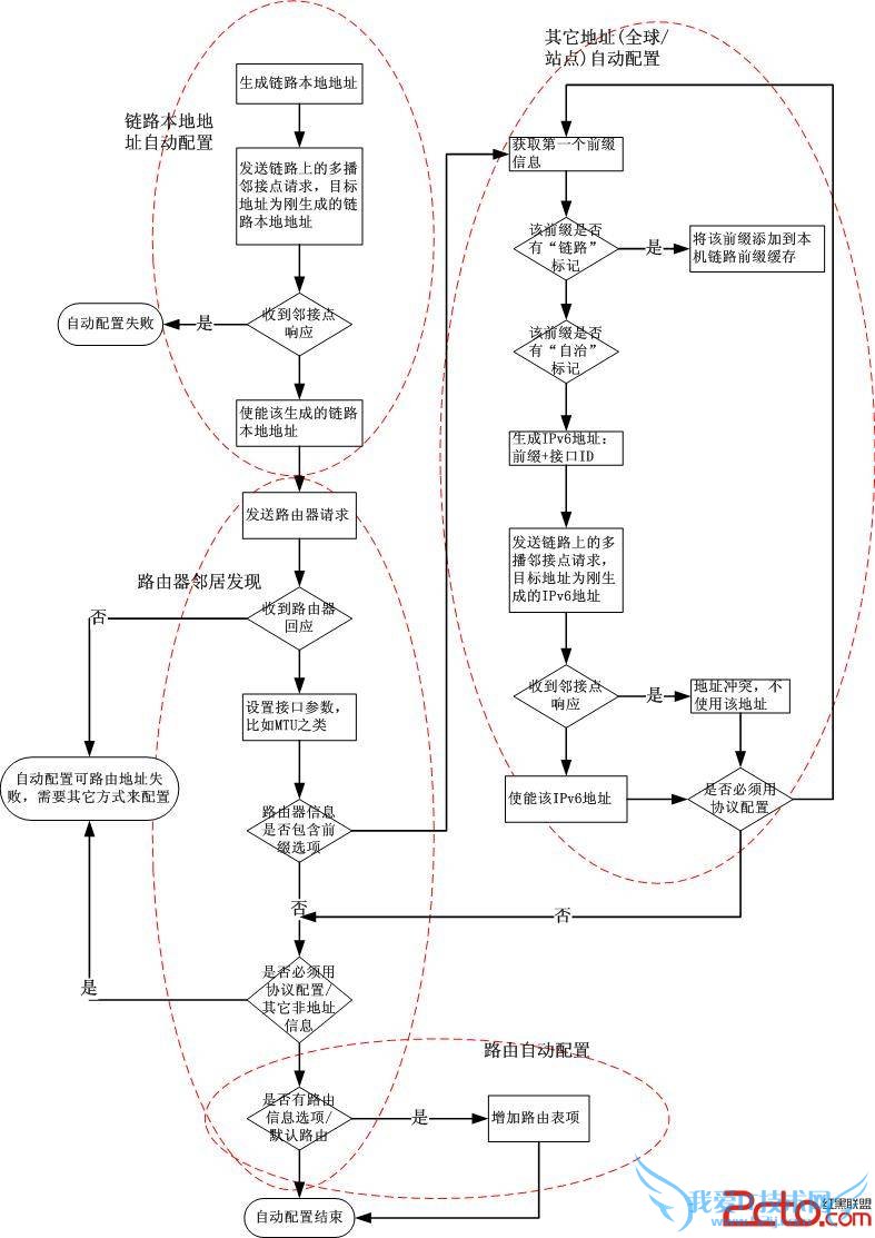 但是IPv6协议规定,使用这个自动生成的链路本地地址不能跨越路由器,我们知道,所谓的互联网就是由路由器连接而成的,互联网数据通信必须跨越路由器,也就是说必须有一个非链路本地地址的IPv6地址。既然有了同一链路可用的链路本地地址,那就意味着使用链路本地地址可以和同一链路的路由器通信了(一个路由器的每一个接口表示一个链路),IPv6定义了很多的邻居发现报文,可以让路由器告诉终端设备接口信息应该配置成什么,这就是所谓的自动配置,从开始到最后,不需要人工干预,普通用户再也不需要为配置地址这种技术型的工作犯愁了。下面就是自动配置的流程图: